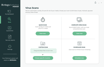 Wanneer u het opstartprogramma opent, wordt u onmiddellijk begroet met het Dashboard, dat een kort overzicht van uw beveiligingsstatus bevat. In het linkerpaneelmenu vindt u het Dashboard met vier andere secties. De sectie Scans is verantwoordelijk voor het scannen op virussen en heeft hiervoor vier verschillende typen: Snelle scan, Volledige virusscan, Aangepaste scan en Geplande scan. Deze zijn vrij eenvoudig in te stellen en de software ondersteunt zelfs een functie voor slepen en neerzetten voor Aangepaste scan.