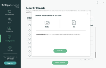 Quarantaine is voor alle gevonden geïnfecteerde bestanden die u kunt verwijderen, herstellen, of uitsluiten van de database van het programma. U kunt hier ook de details van de bestanden bekijken. Het gedeelte Beveiligingsrapporten bevat alle rapporten en informatie over uw pc en u kunt ervoor kiezen om scanrapporten, realtime rapporten of uitsluitingsrapporten te controleren. Ten slotte, Instellingen is waar alle andere configuraties kunnen worden gedaan. Hiervoor zijn vier subsecties: Algemeen, Beveiliging, Account en Info.